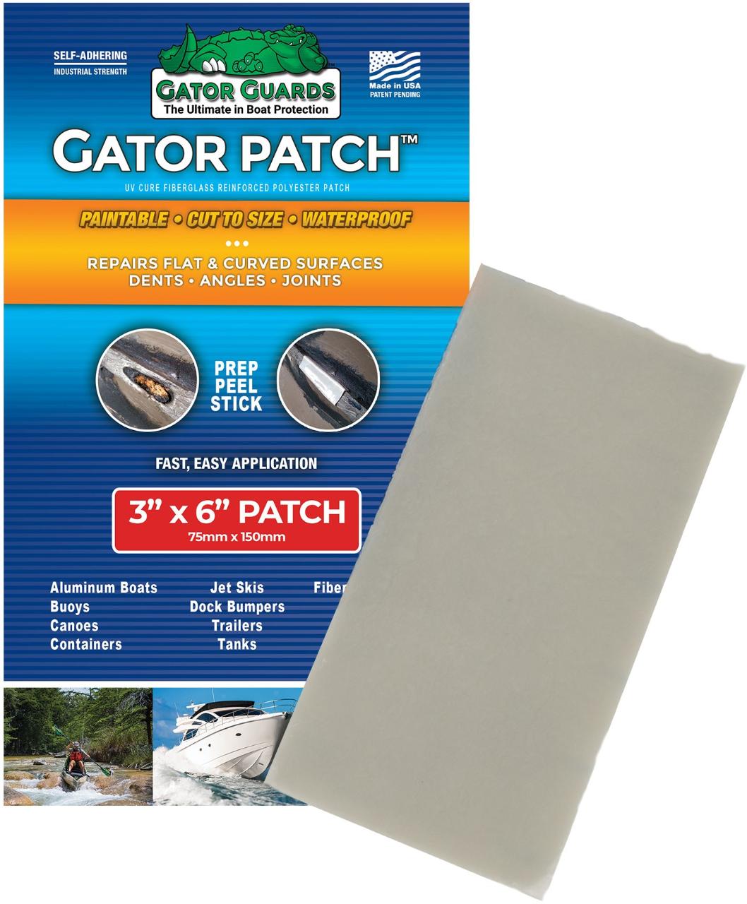 Quickly fix your kayak, canoe or other watercraft with the 3 x 6 in. Gator Guards Gator Patch. It's watertight and impenetrable for permanent application to dings in plastic, fiberglass and aluminum.