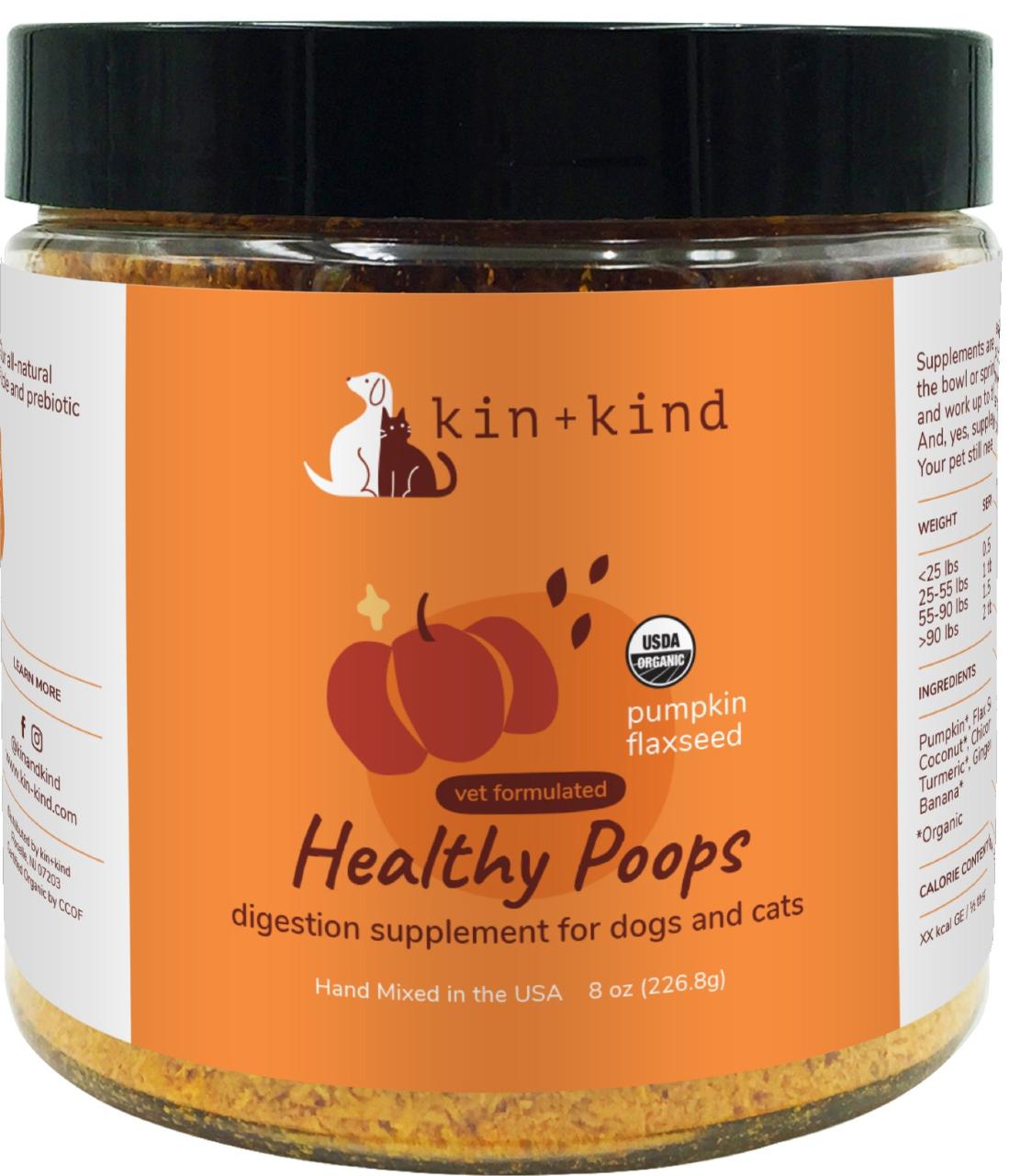 Does your pet need help going? Or help not going? The all-natural kin+kind Organic Healthy Poops supplement for dogs and cats provides the perfect mix to support a strong gut and healthy digestion.