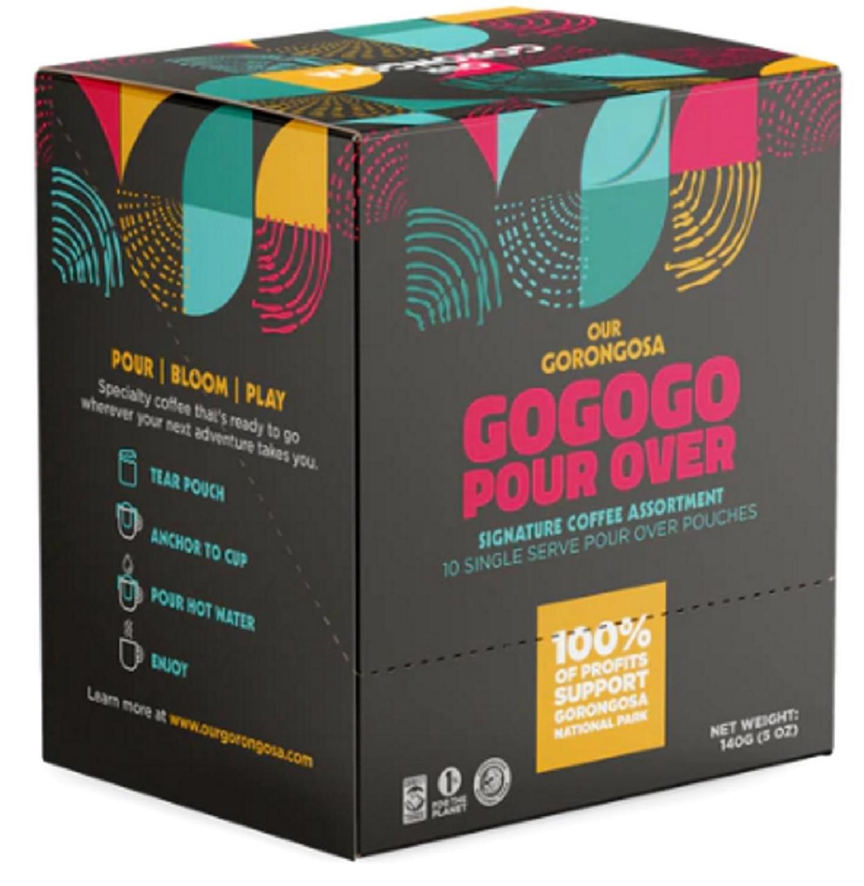 Get your day started right with a hot cup of joe the next time you're camping. This box of Gorongosa Gogogo Pour Over coffee includes 10 pouches with a mix of light, dark and medium roasts.