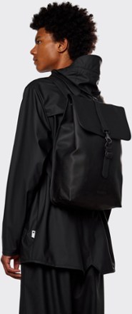 Characterized by its prominent flap and central strap with carabiner closure, the waterproof RAINS Rucksack is a clean and ever-contemporary choice for urban excursions in any weather conditions.